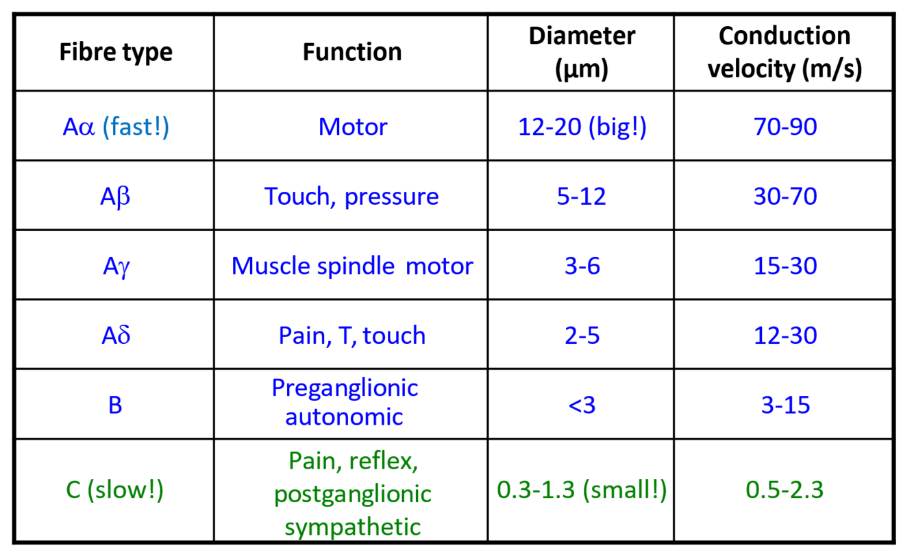 List different types of stimuli (sensory modularities) conducted by different classes of nerve fibres in peripheral nerves