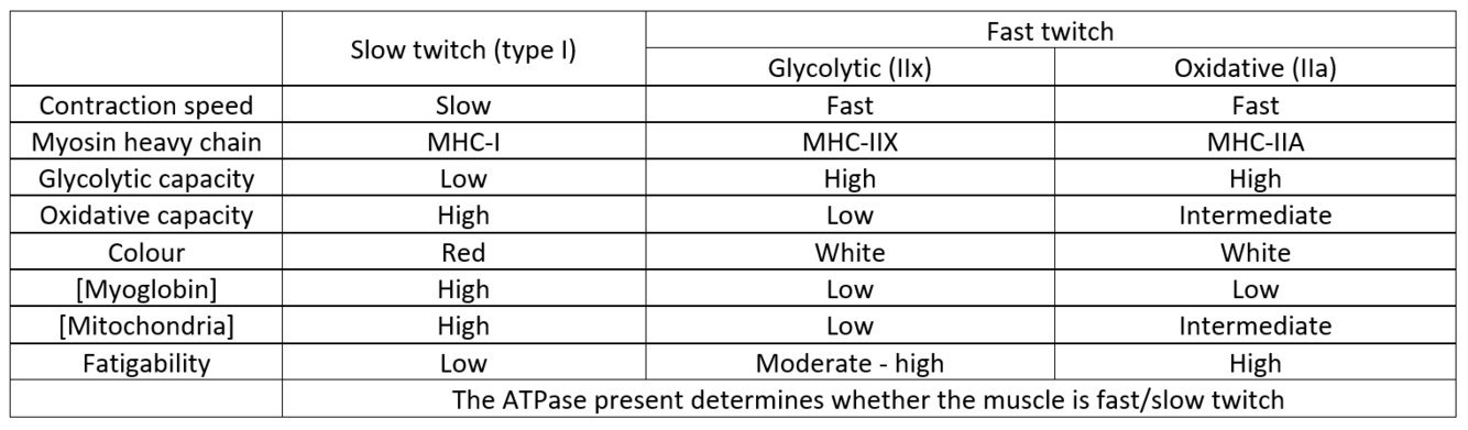 Fast twitch: Glycolytic (Type IIa) and Oxidative (Type IIOx)