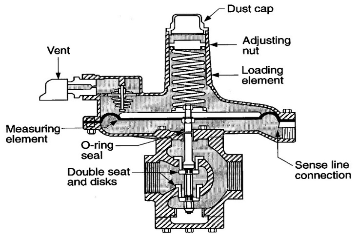 In the above image at what point is the sense line connected to the main supply piping?