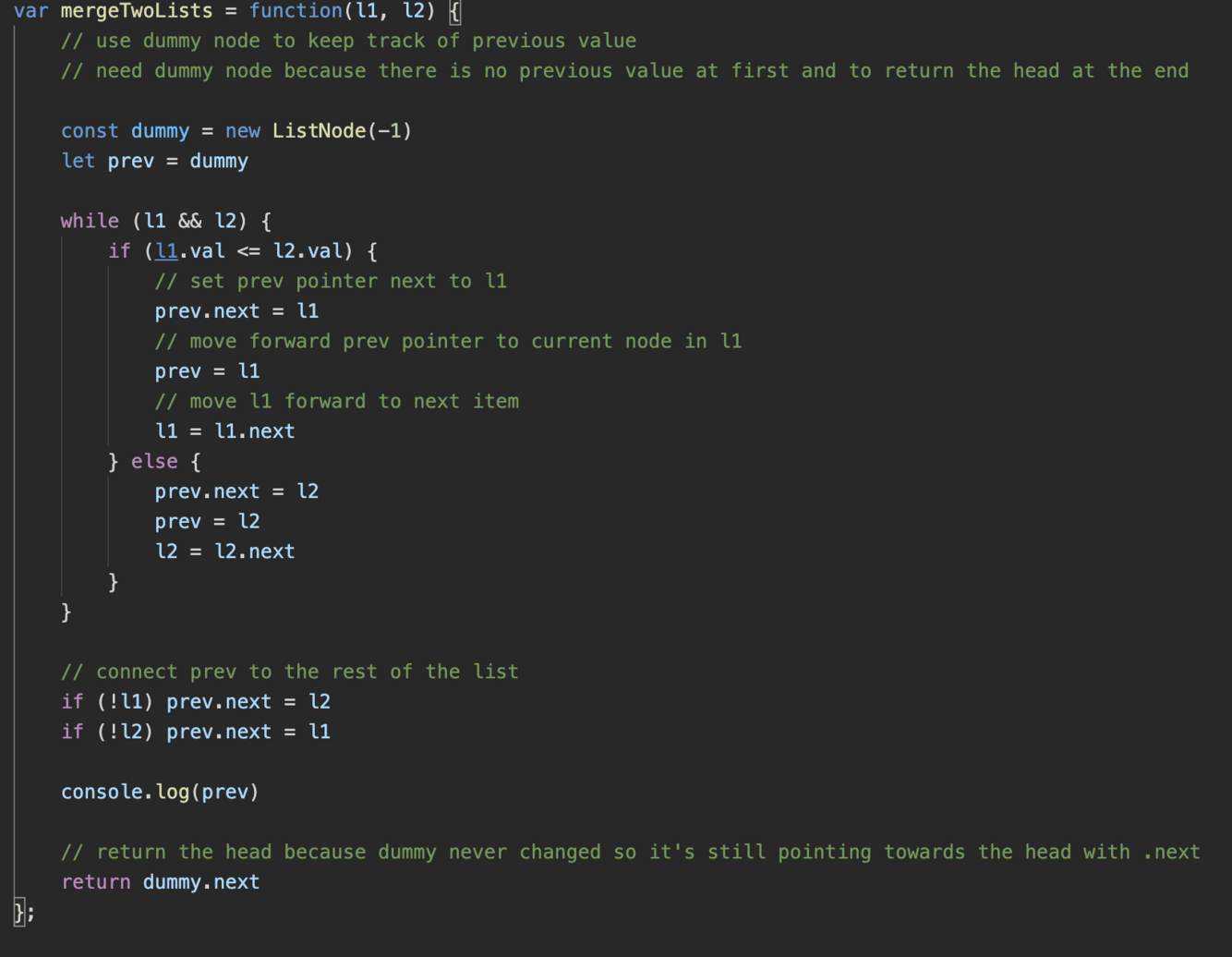Then, when one list has run out, connect prev (the last value to be added to the merged list), to the remaining list.