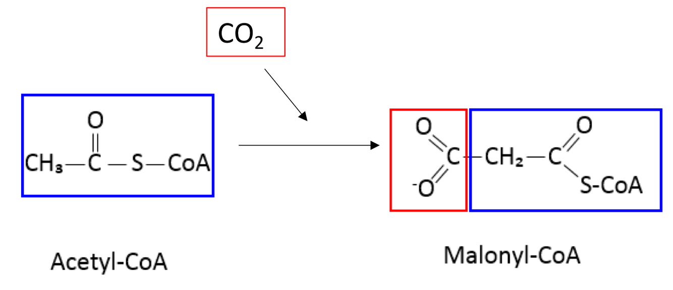 (malonyl CoA= acetyl CoA w/ extra CO2 group)