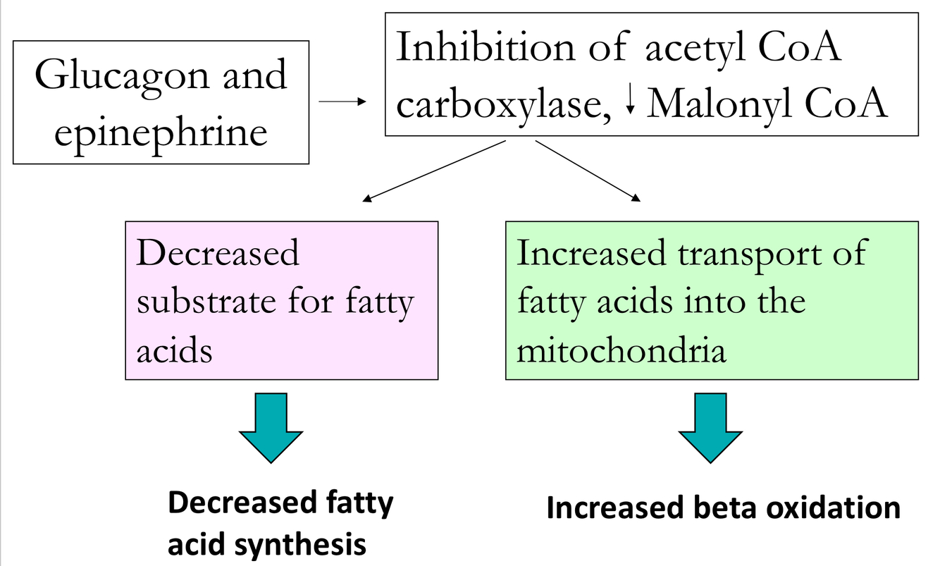 Glucagon promotes beta ox (and therefore decreases fatty acid synthesis)