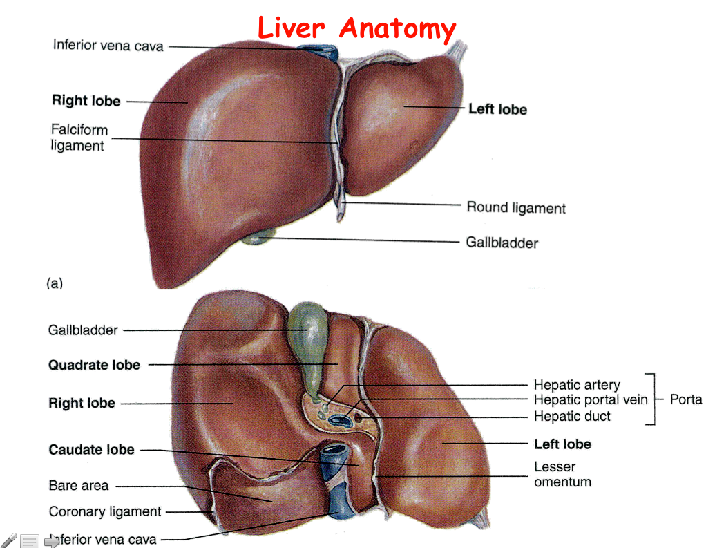 •, lymphatic vessels, ducts (right/left hepatic ducts Þ common hepatic duct), nerves (hepatic nerve plexus) via Porta on inferior surface