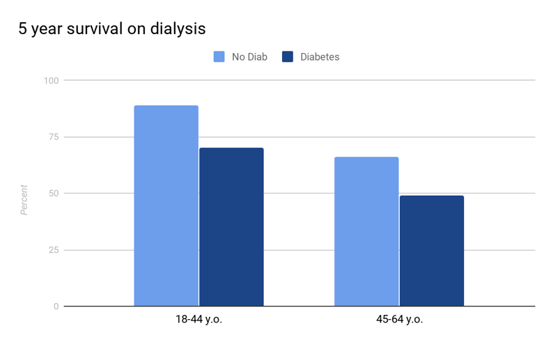 Renal failure ultimately leads to death in 21% of people with Type 1 and 11% of people with Type 2 diabetes