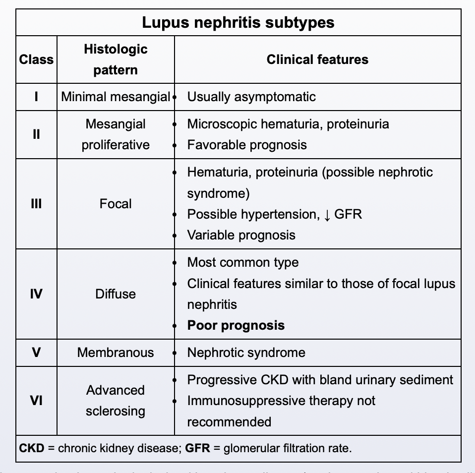 Class IV (diffuse lupus nephritis) has the worst prognosis and requires aggressive immunosuppression (steroids + cyclophosphamide or mycophenolate mofetil).