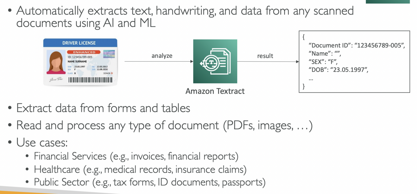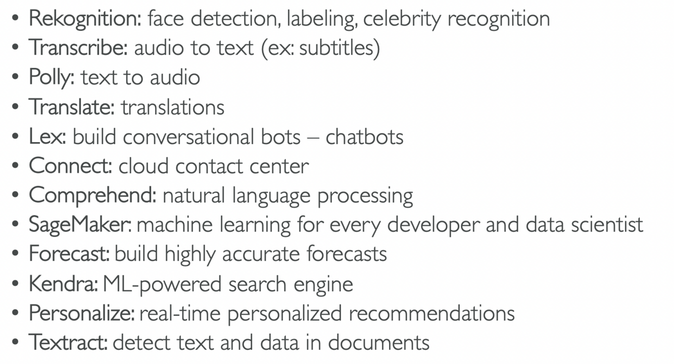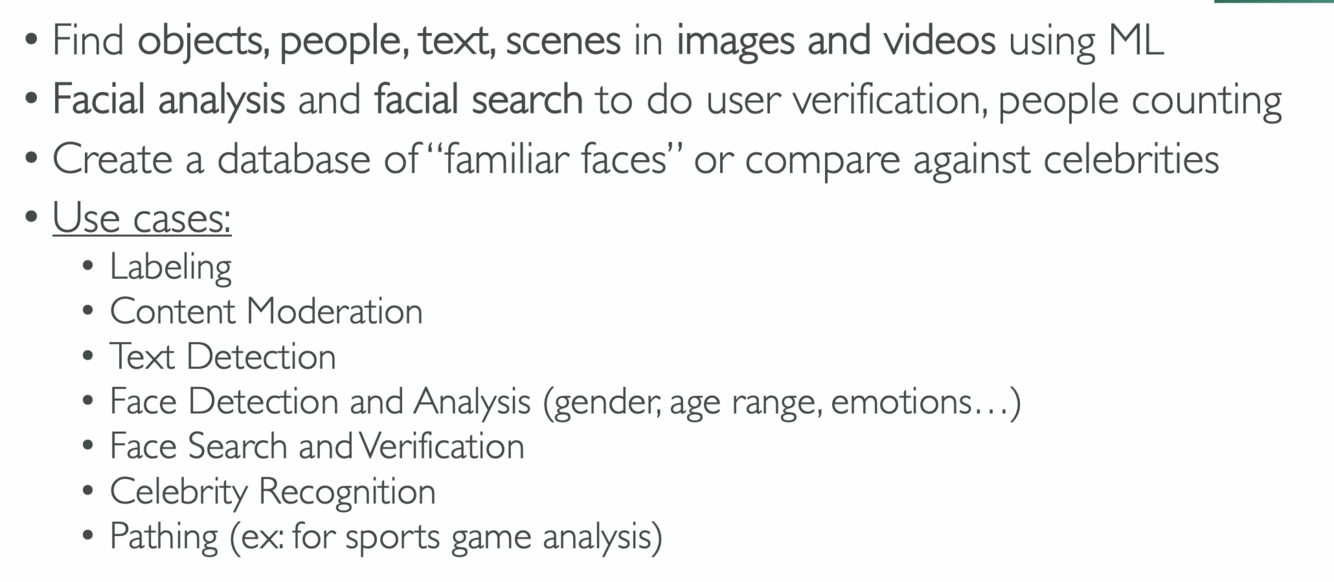 Which AWS service performs face detection, labeling, celebrity recognition?