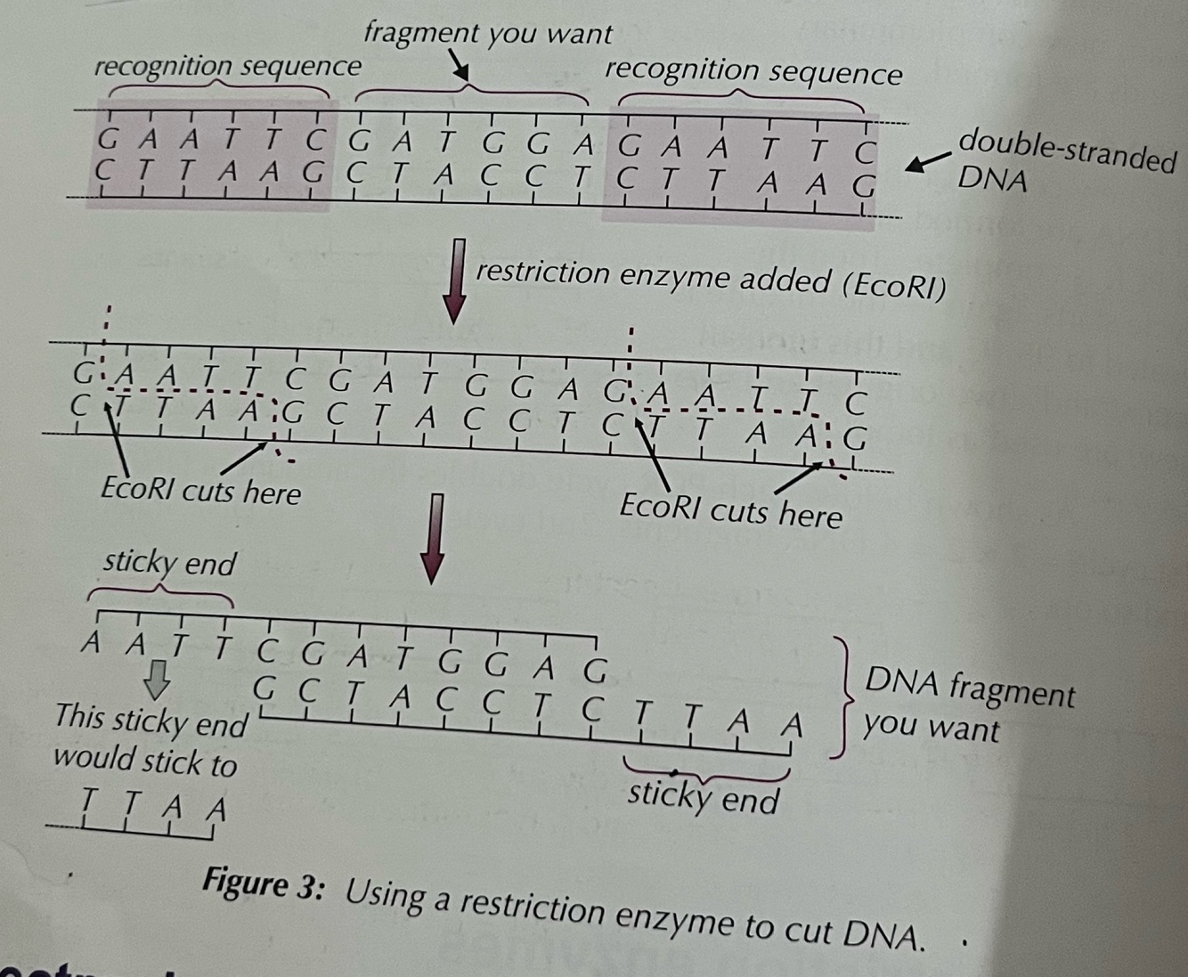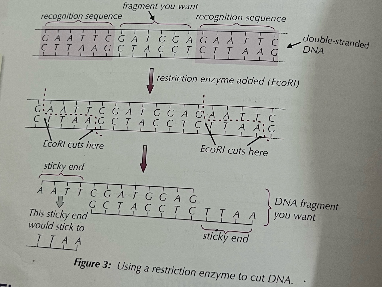 If recognition sequences are present at either side of the dna fragment you can use restriction enzymes to seperate it from the rest of the dna. The dna sample is incubated with the specific restriction enzyme which cuts the dna fragment via a hydrolysis reaction . Sometimes the cut leaves sticky ends-small tails of unpaired bases at each end of the fragment. Sticky ends can be used to bind (anneal) the DNA fragment to another piece of DNA that has sticky ends with complementary sequences.