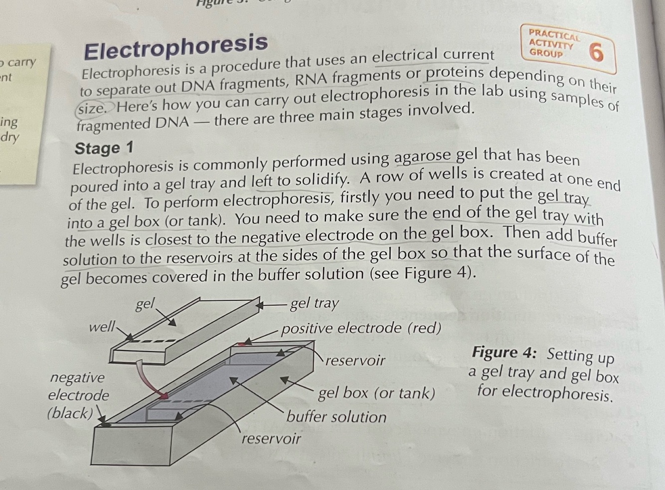 Stage 1- electjroheris is commonly performed using agarose gel that had been poured into a gel tray and left to solidly.a row of wells is created at one end of the gel. To perform electropherosis,firstly you need to put the gel tray into a gel box.you need t9 make sure the end of the gel tray with the wells is closest to the negative electrode on the gel box. Then add buffer solution to the resinous at the sides of the gel box so that the surface of the gel becomes covered in the buffer solution