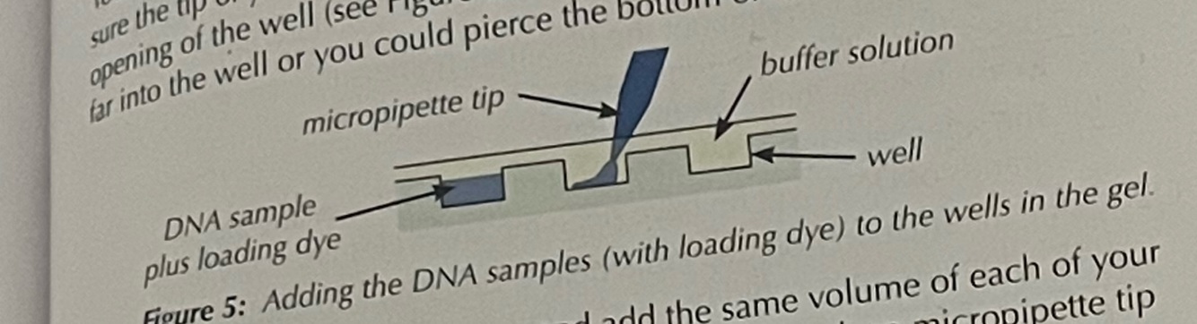You have to be really careful when adding the samples to the wells - make sure the tip of your micropipette is in the buffer solution and just above the opening of the well (see Figure 5). Don’t stick the tip of the micropipette too far into the well or you could pierce the bottom of it.