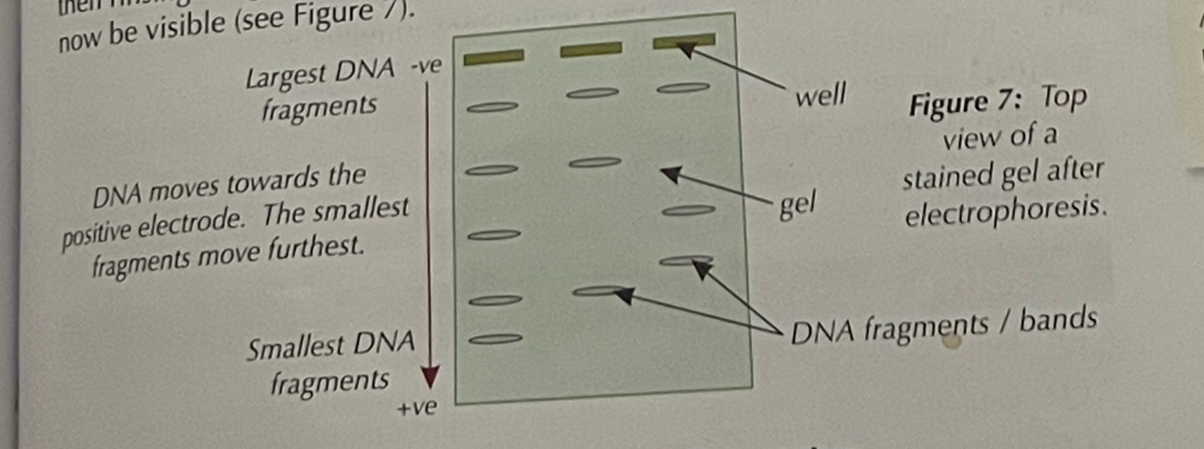 DNA fragments are negatively charged, so they’ll move through the gel towards the positive electrode at the far end of the gel (called the anode).