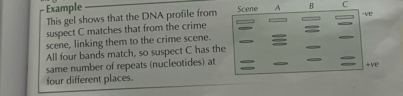 The number of times a sequence is repeated at different, specific places (loci) in a person’s genome (and so the number of nucleotides there) can be analysed using electrophoresis. This creates a DNA profile. The probability of two individuals having the same DNA profile is very low because the chance of two individuals having the same number of sequence repeats at each locus in DNA is very low.