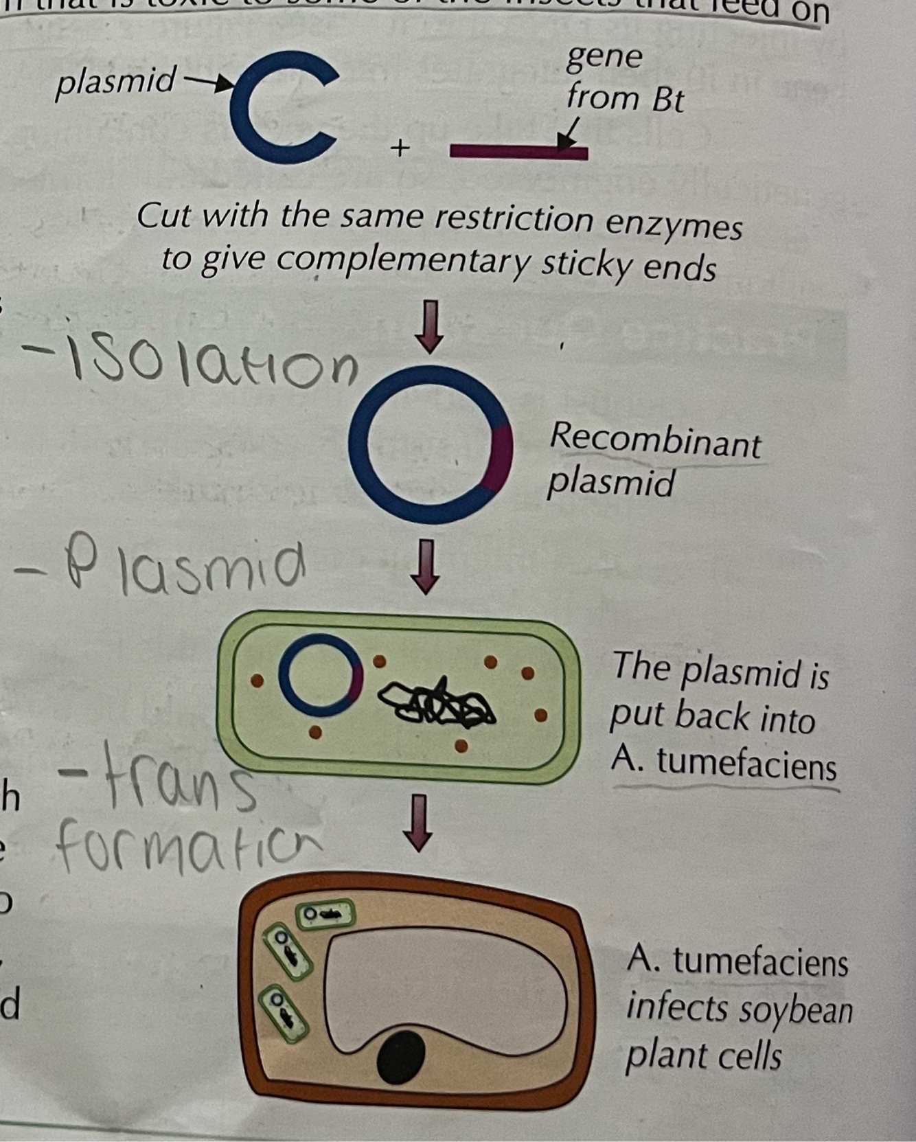 Step 1- to genetically modify a soybean plan the desired gene can be isolated from bt using resurrection enzymes and insteted into a plasmid taken from bacterium agrobacteriym tumefaciens.