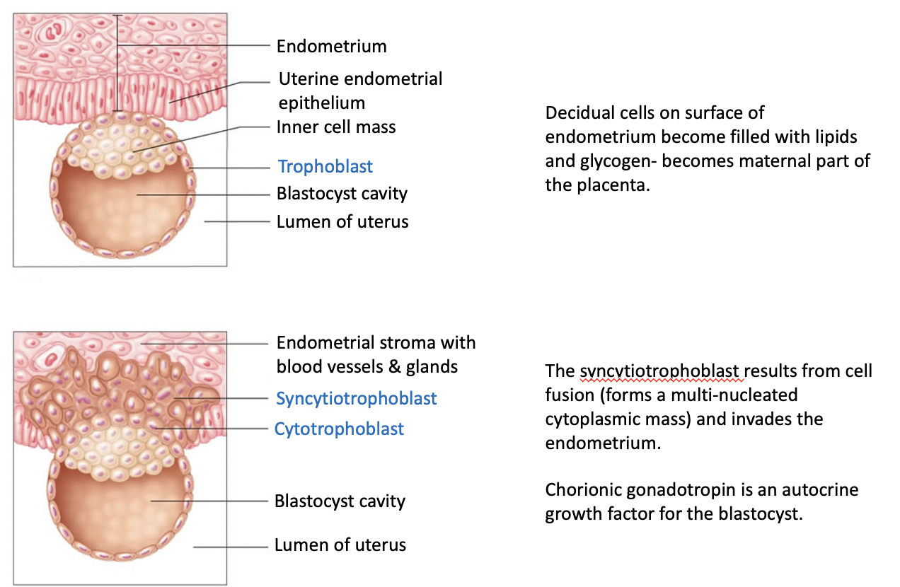 Cells fuse to form a multi-nucleated syncytiotrophoblast & invades the endometrium.