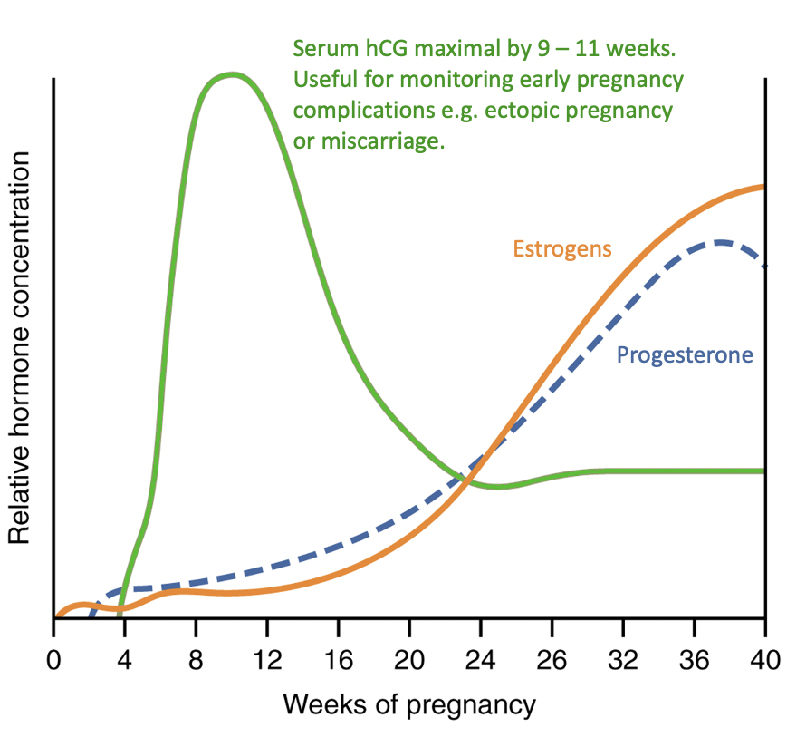 Human chorionic gonadotrophin (hCG) secreted by the syncytiotrophoblast increases rapidly