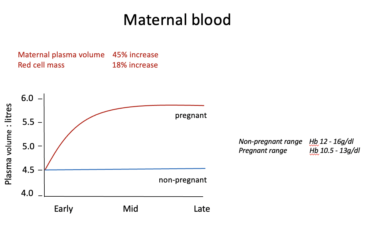 Circulating volume increases from 4.5 to 6.0L - this leads to apparent anaemia as Hb conc. also falls (Haemodilution effect)