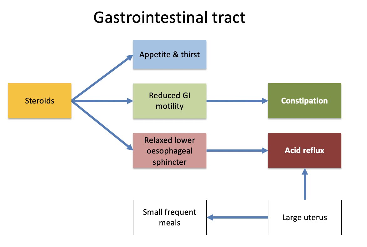 3 effects of pregnancy on the GIT?