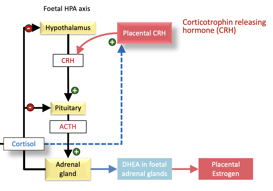 DHEA aromatized into estrogen by placenta -> Increasing E:P ratio & stimulating prostaglandins