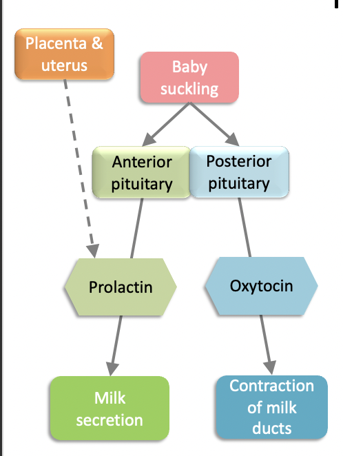 Stretching of uterus & cervix in birth + nipple stimulation during breastfeeding release oxytocin from posterior pit. This helps w parturition, bonding + lactation
