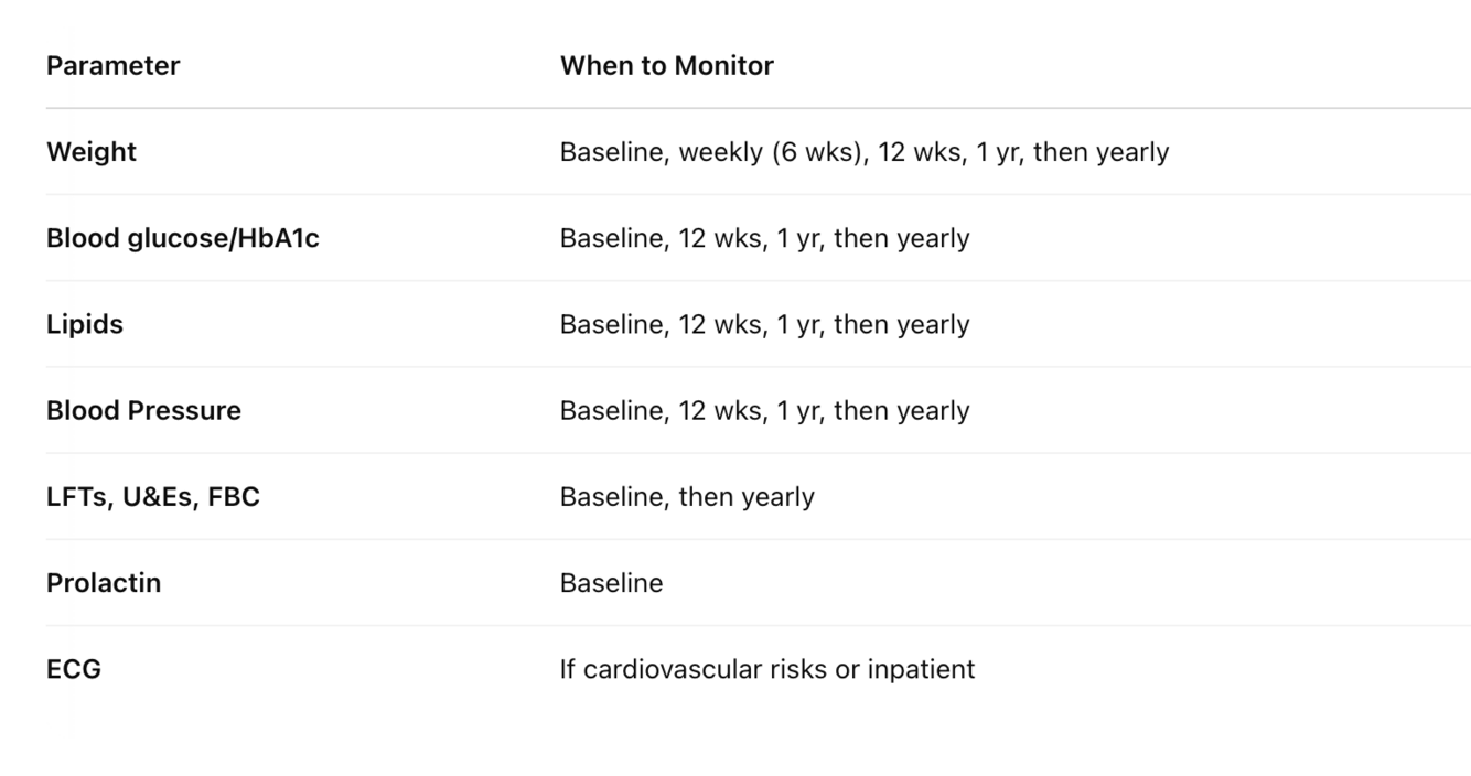 Fasting blood glucose, HbA1c, and blood lipid concentrations should be measured at baseline, at 12 weeks, at 1 year, and then yearly. Prolactin concentrations should also be measured at baseline.