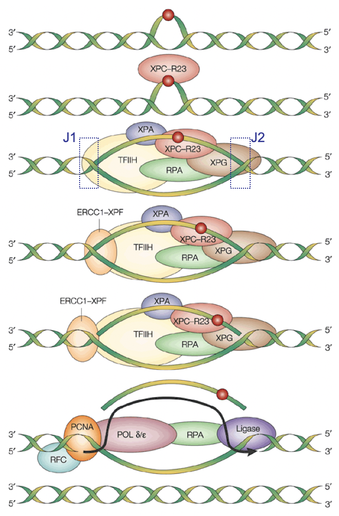 XPC-R23 detects damage and creates a bubble by recruting other proteins that promote DNA unwinding, which creates 2 junctions