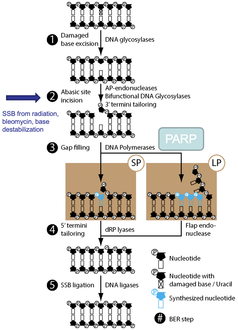 The gap is then filled via a short patch (SP) or a long patch (LP), with PARP being involed in LPs