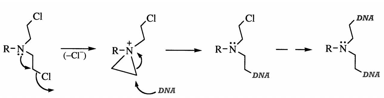 The postiviely charged nitrogen that is formed can be attacked by DNA (which is nucleophillic), which causes strand breaks
