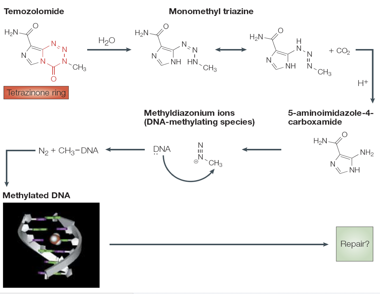 It is broken down to methyldiazonium ions, which are a DNA methylating species….which will cause DNA damage
