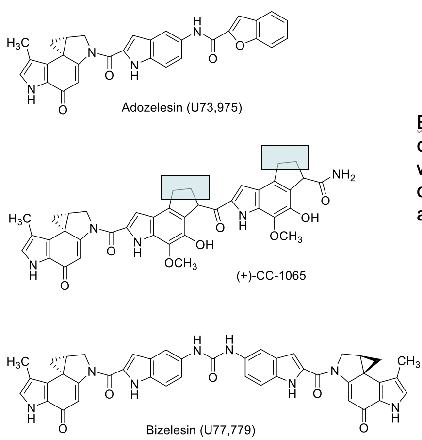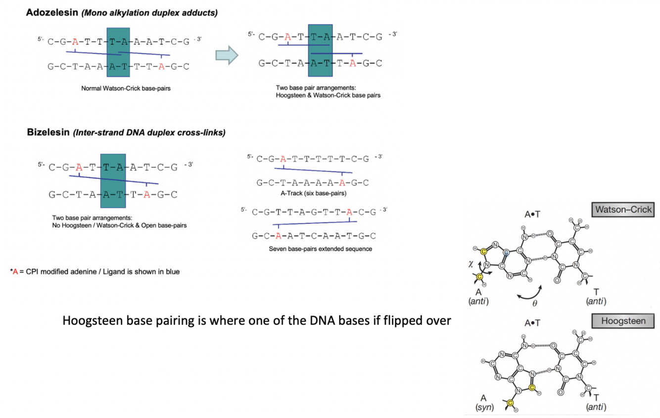Adozelesin–> Can form both Watson/Crick base pairing and Hoogsteen base pairing, which makes DNA repair much harder