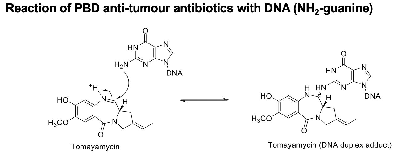 A reversible aminal bond between the exo-cyclic NH2 of guanine (the only base it will bind with) and the C11 of the PBD