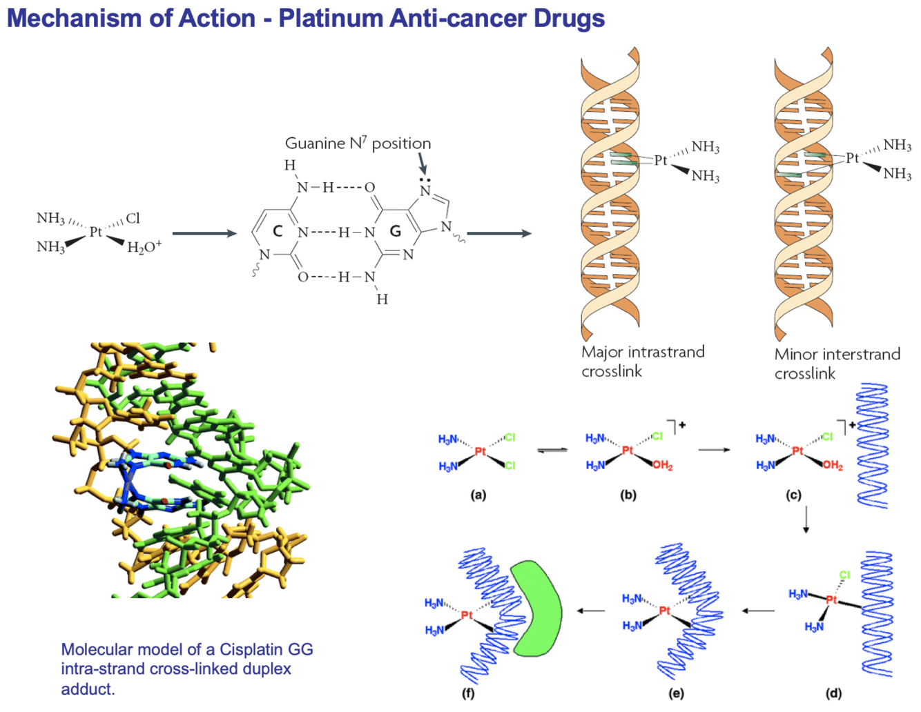 The 2 Cls create a complex with water which is positively charged, so can be attacked by DNA….usually by guanine at N7