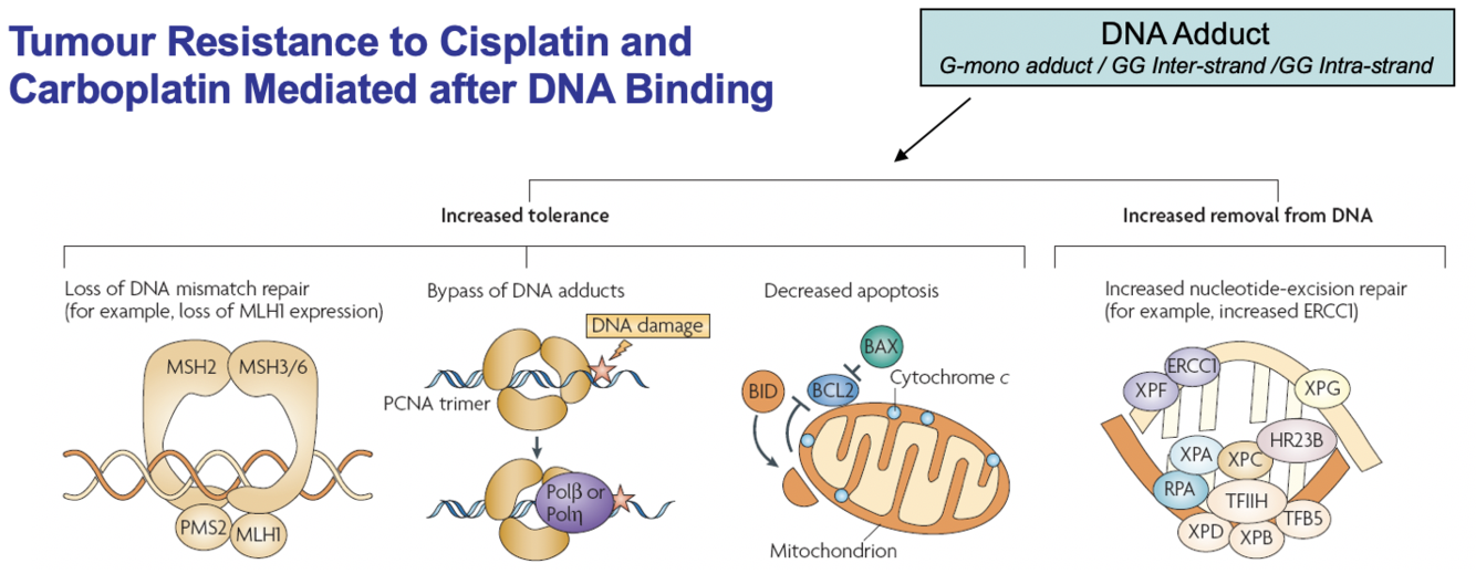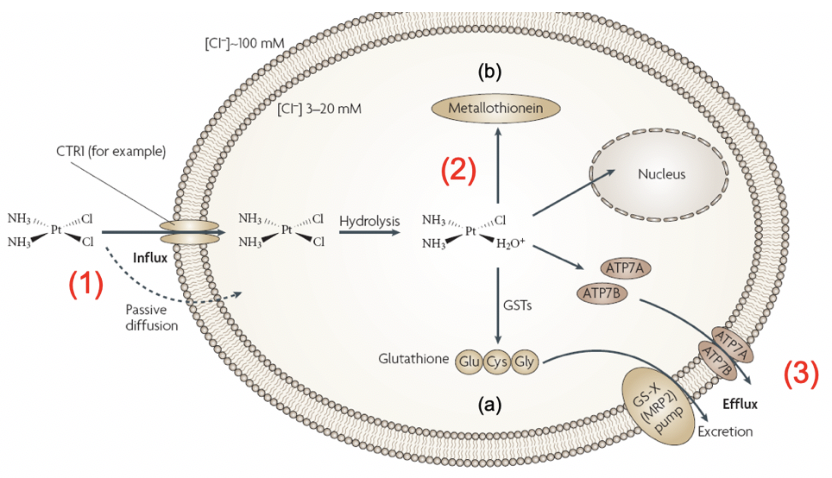 Copper exporters (ATP7A/B) and glutathione-drug conjugate exporters are upregulated in cancer, causing the platinums to be pumped out of the cell