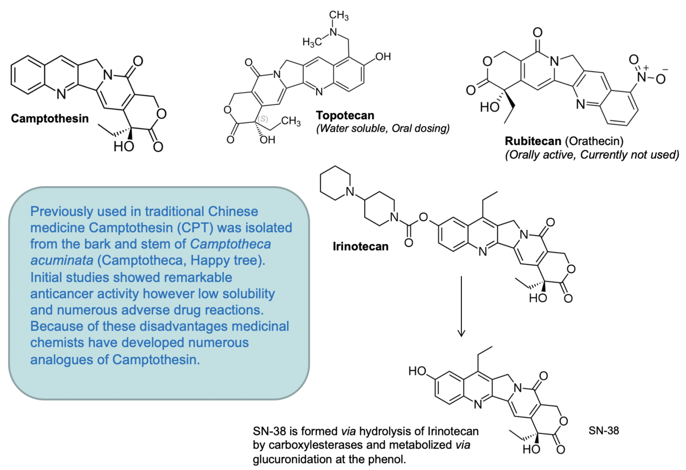 Evolved from Camptothesin, whcih had low water solubility and several ADRs