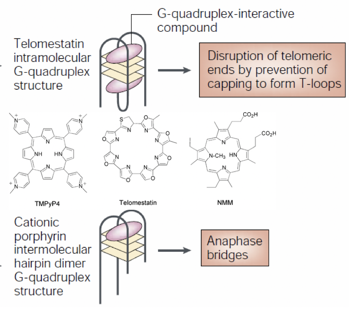 Form at the end of DNA strands, stabilising them. They become more stabilised when drugs bind. The increased stability means that DNA polymerase and telomerase cant bind, so DNA can’t replicate.