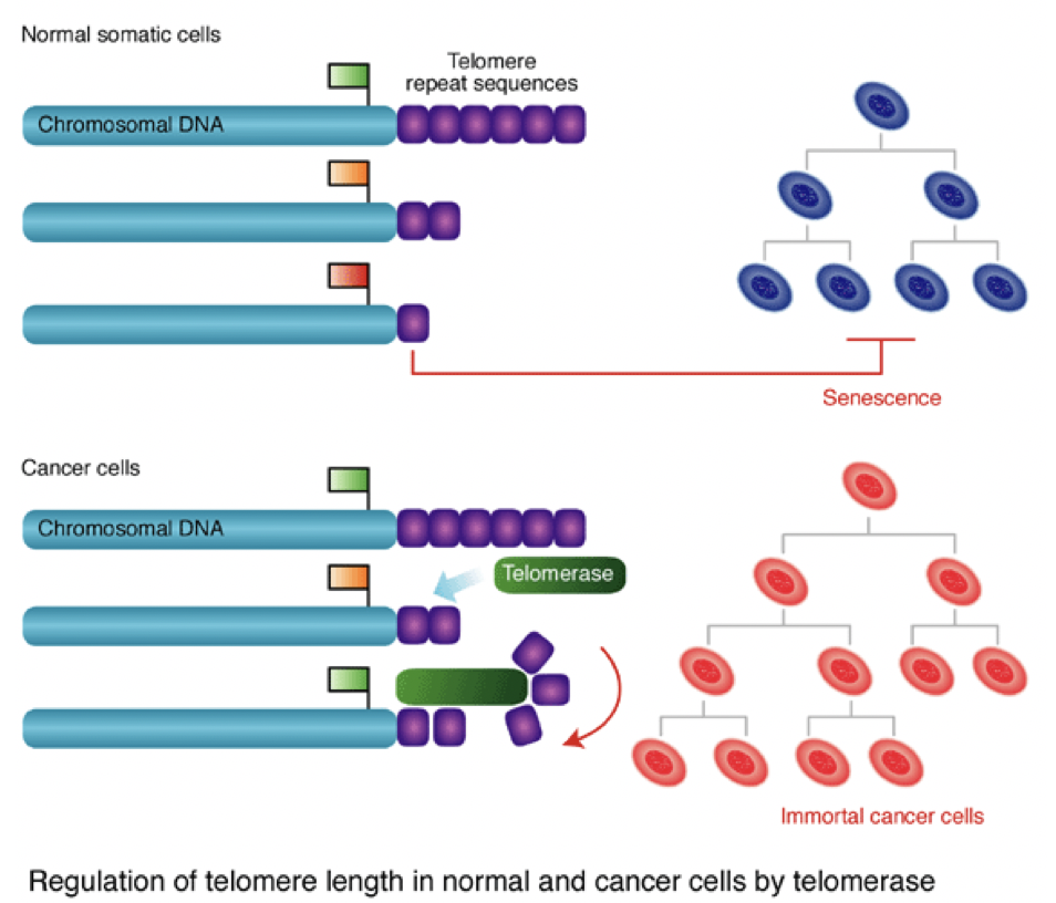 These are always present in cancer cells, so cells never die! As when the telomere repeat sequences are almost fully degraded, the telomerase just adds some more….whereas in healthy cells they would just die off