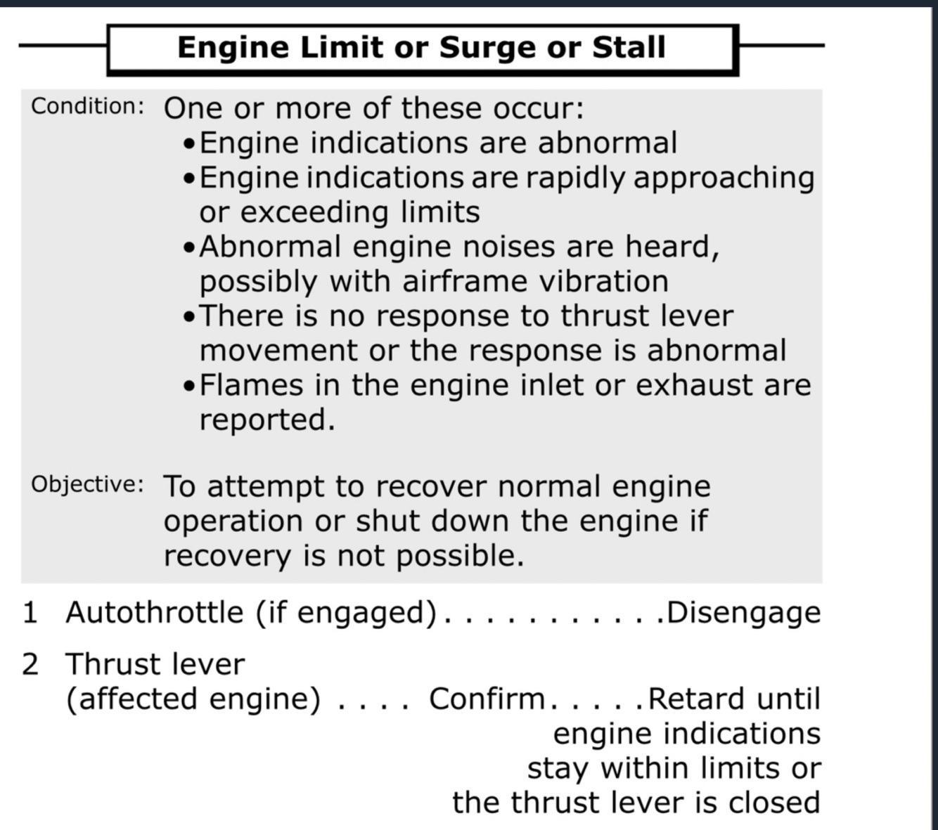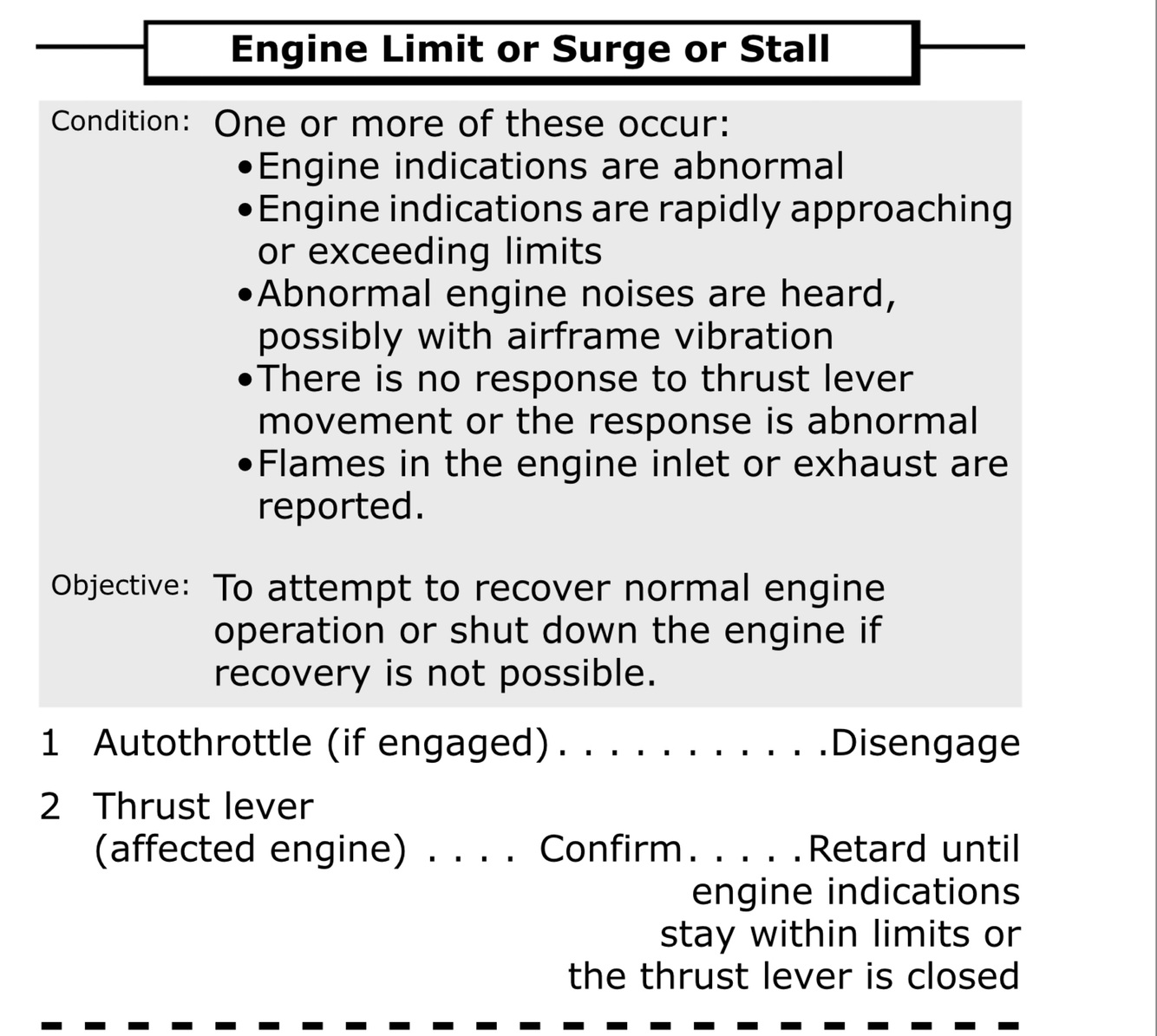 Many engine surge or stall events are recoverable and permit continued engine operation. Stabilized engine indications and decreasing EGT indicate the surge/stall has cleared. In these cases, the engine may be operated normally, or at a reduced thrust level which is surge and stall free.