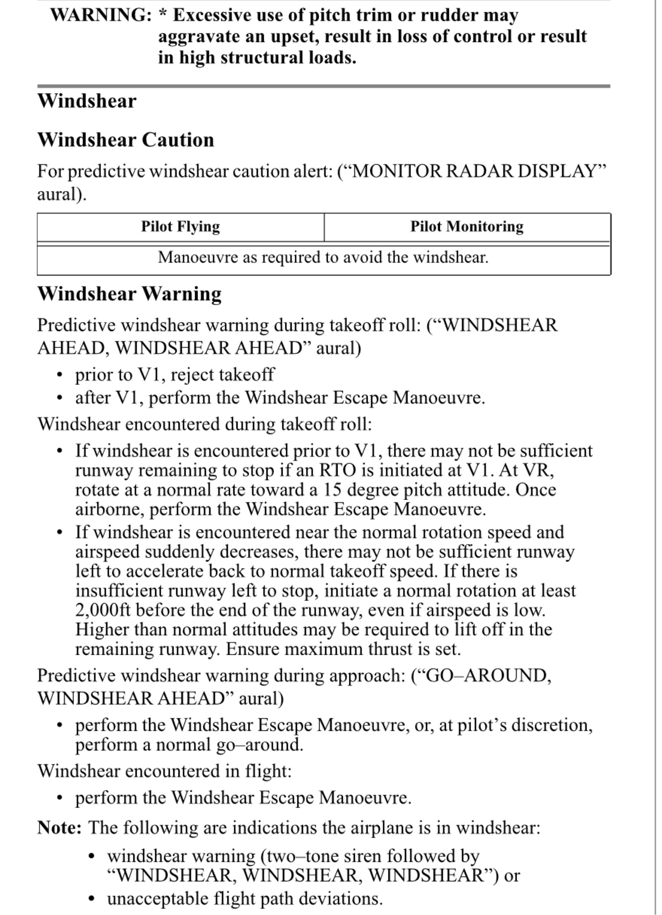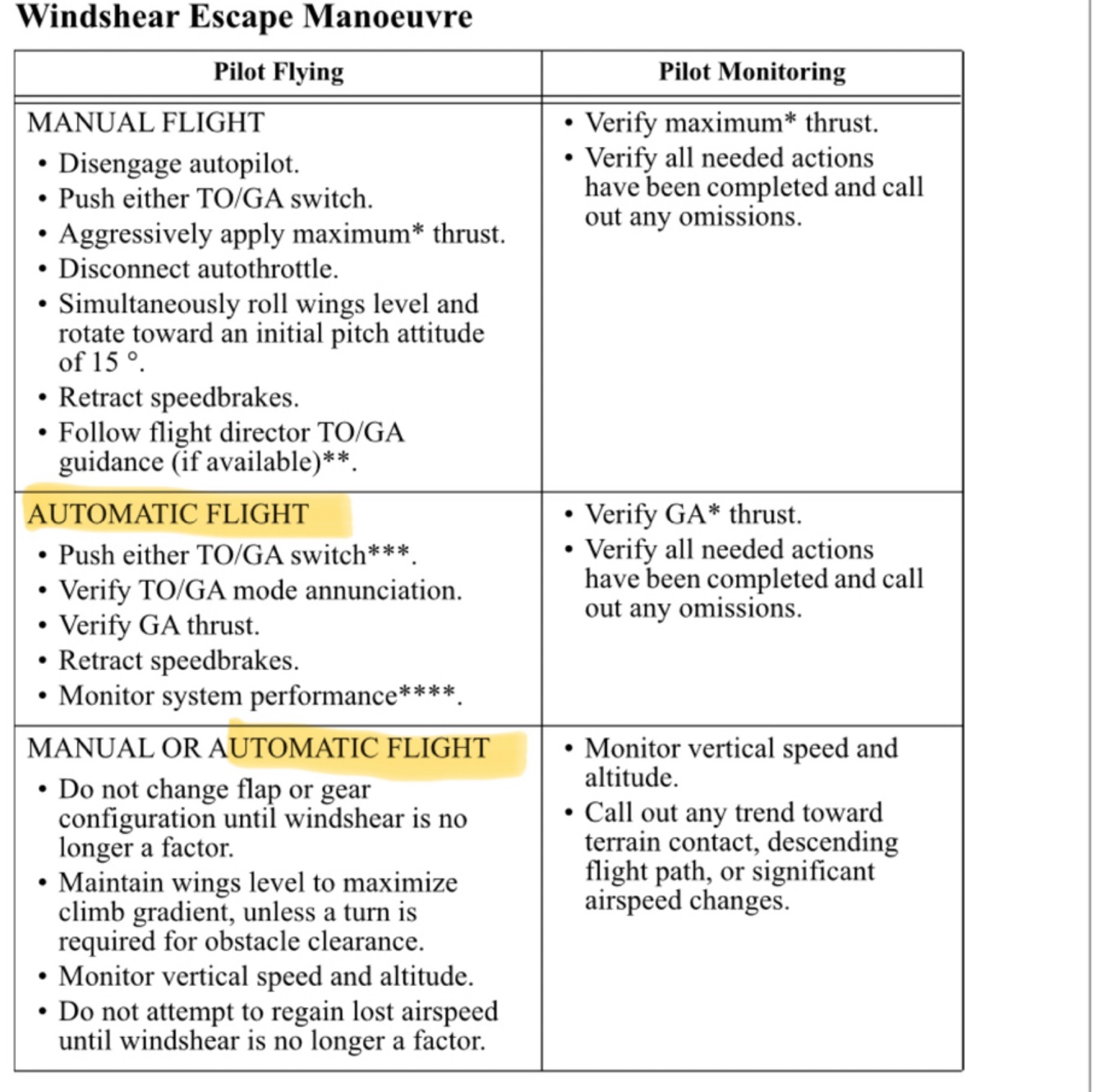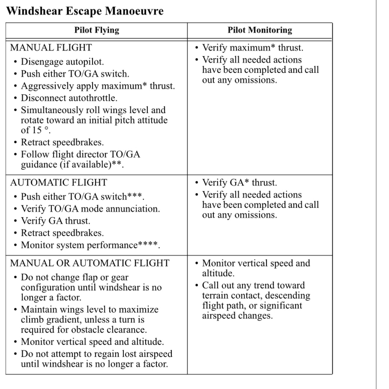 Wind shear escape, Manual