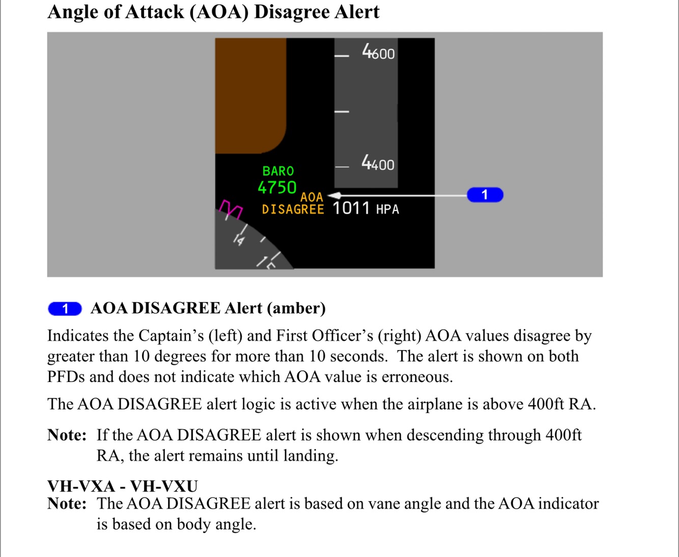 If the Flight Crew suspects that the unreliable airspeed condition may be caused by erroneous AOA, in addition to the above flight deck indications, the AOA DISAGREE alert is shown on both PFDs and erroneous minimum and maximum speed bars are shown on one side. In this situation, comparing indicated airspeed on the PFDs with the ISFD can help the Flight Crew determine a reliable airspeed indication