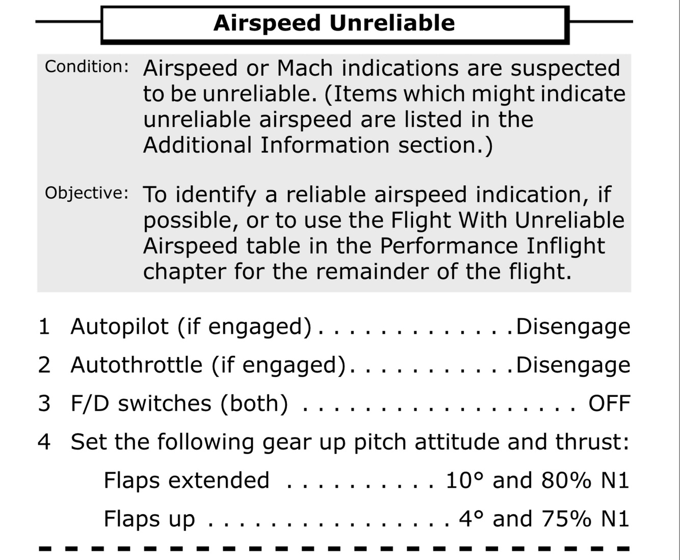 If an airspeed unreliable event occurs during approach, and a go-around or missed approach is necessary, execute a go-around using go-around thrust and smoothly increase pitch towards a normal takeoff pitch attitude. Upon reaching a safe altitude set the target pitch attitude and thrust settings from the Airspeed Unreliable NNC and accomplish the checklist.