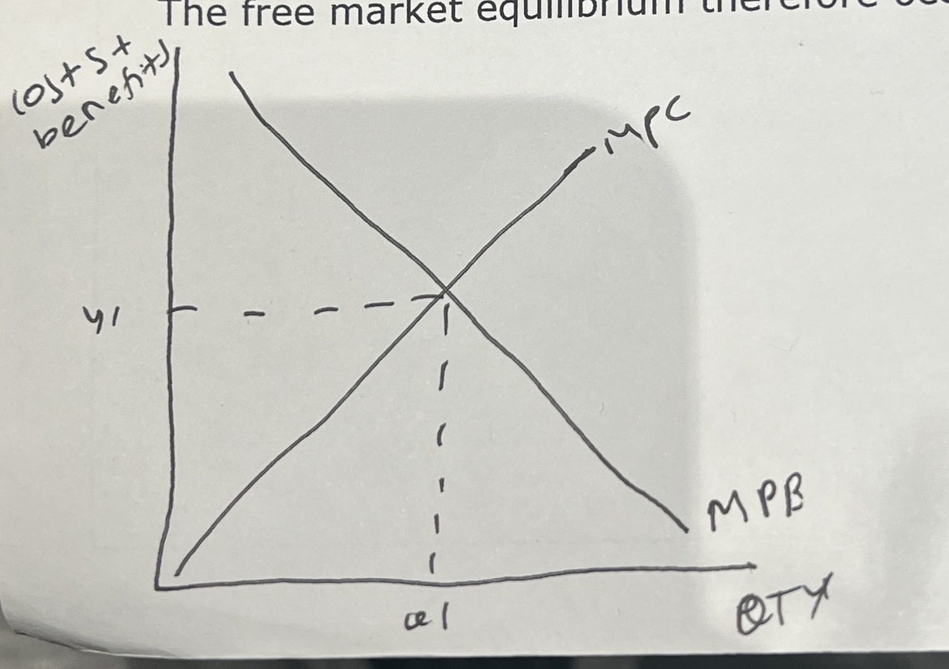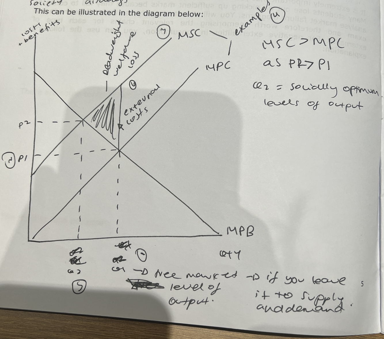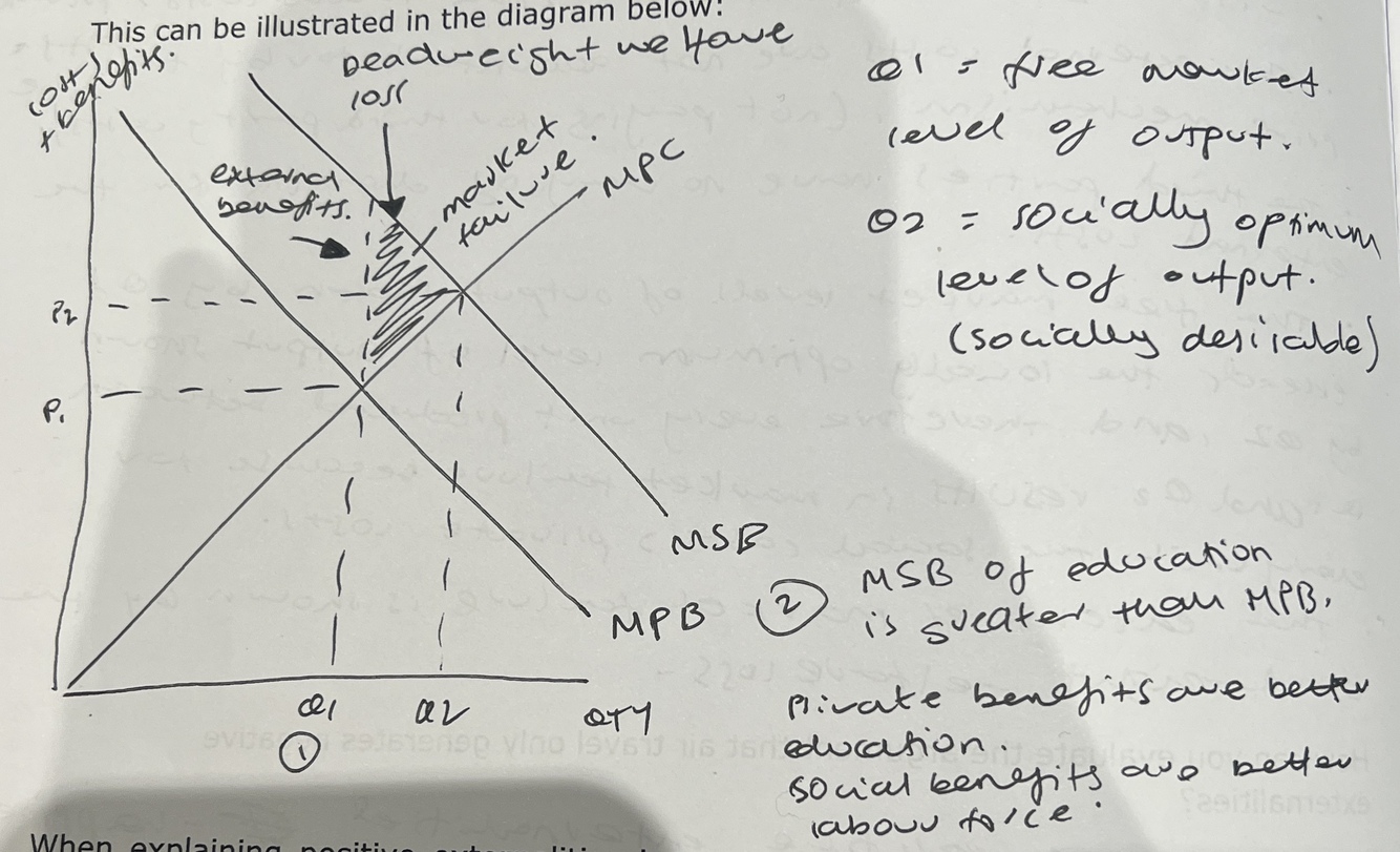 The marginal social benefits are greater than marginal private benefits. The external benefits are not accounted for by the price mechanism. This is because individuals only consider private benefits and private costs. Q1 shows the free market level of output, this is the level of output which would be generated if there was no government intervention. Q2 shows the socially optimum level of output. This difference between Q1 and Q2 shows market failure (misallocation of resources). THis is because for every unit between Q1 and Q2, the social benefit is greater than private benefit. The extent of market failure is shown by the deadweight welfare loss.