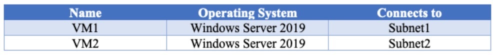 Subnet1 and Subnet2 are in a virtual network named VNET1. The subscription contains two network security groups (NSGs) named NSG1 and NSG2. NSG1 uses only the default rules.