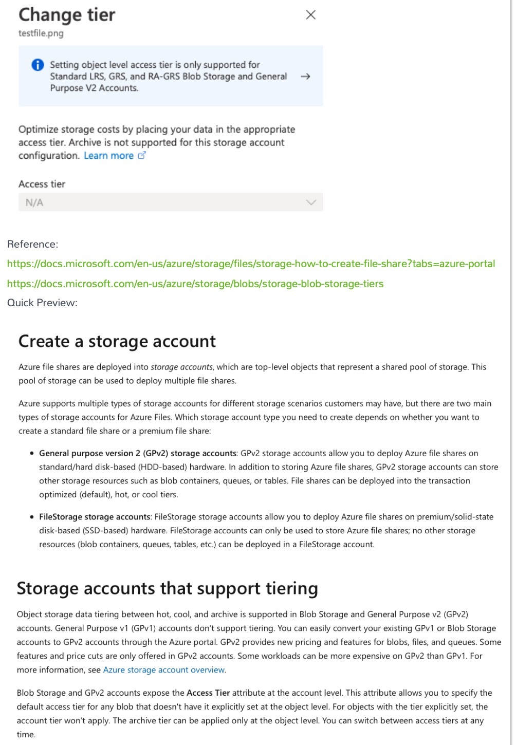 https://docs.microsoft.com/en-us/azure/storage/files/storage-how-to-create-file-share?tabs=azure-portal https://docs.microsoft.com/en-us/azure/storage/blobs/storage-blob-storage-tiers