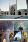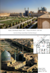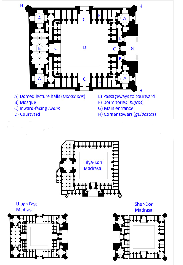 [Layout] square bldg organized around a courtyard. Monumental entrance w/ 2-story Iwan / 4 interior iwans at courtyard / 4 darskhans or domed lecture halls / long mosque at back