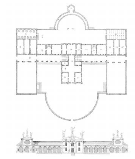 [Upper Sala] mid-facade as high as the roof, projects forward w/ coupled columns at corners