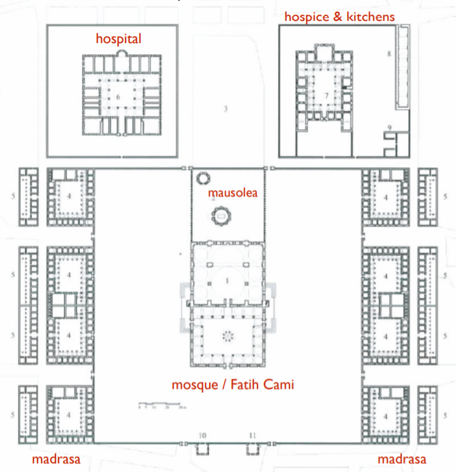 originally included, imaret, hospital, coffeehouses, religious school, bath complex - a tight link between the public realm and the sacred