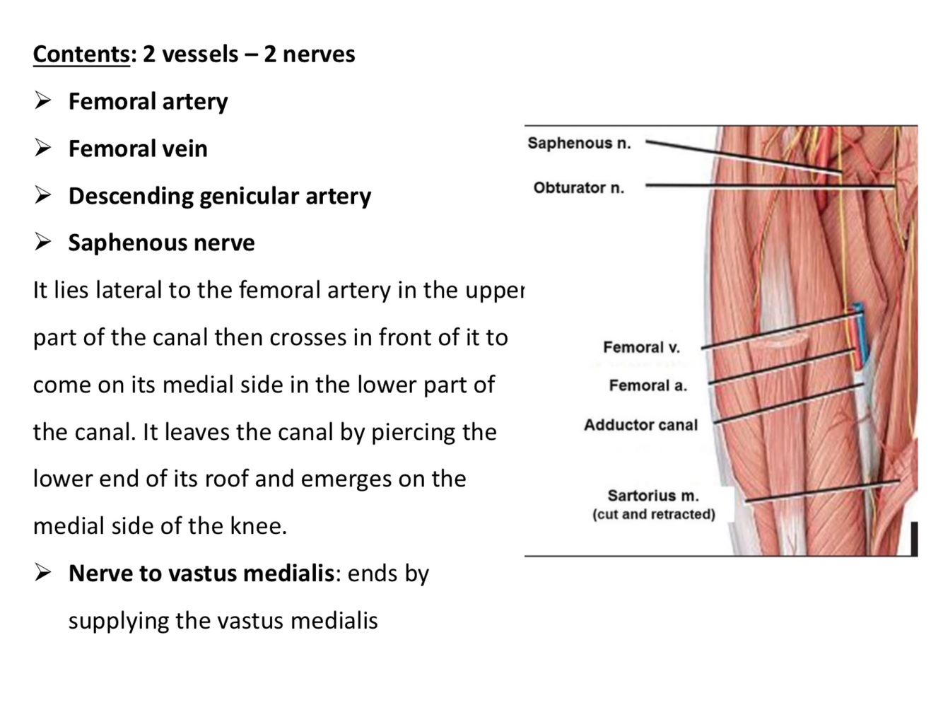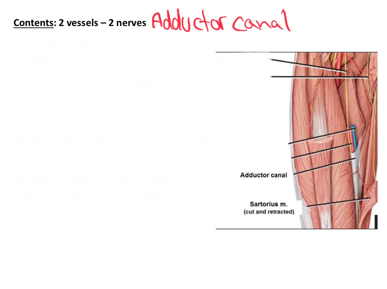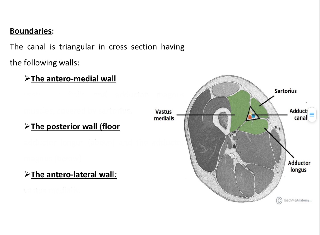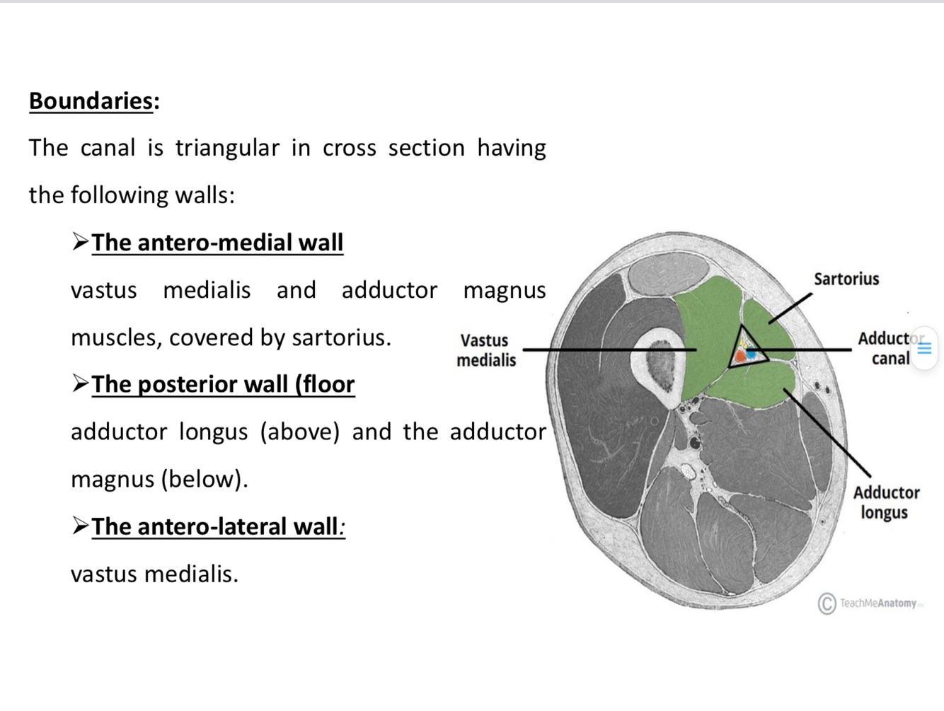 It is an intermuscular tunnel situated on the medial aspect of the middle 1/3 of the thigh under cover of the sartorius muscle.