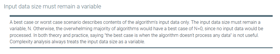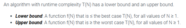 Given a function T(N), an infinite number of lower bounds and upper bounds exist. Ex: If an algorithm’s best case runtime is T(N) = 5N + 4, then subtracting any nonnegative integer yields a lower bound: 5N + 3, 5N + 2, and so on. So two additional criteria are commonly used to choose a preferred upper or lower bound. The preferred bound: