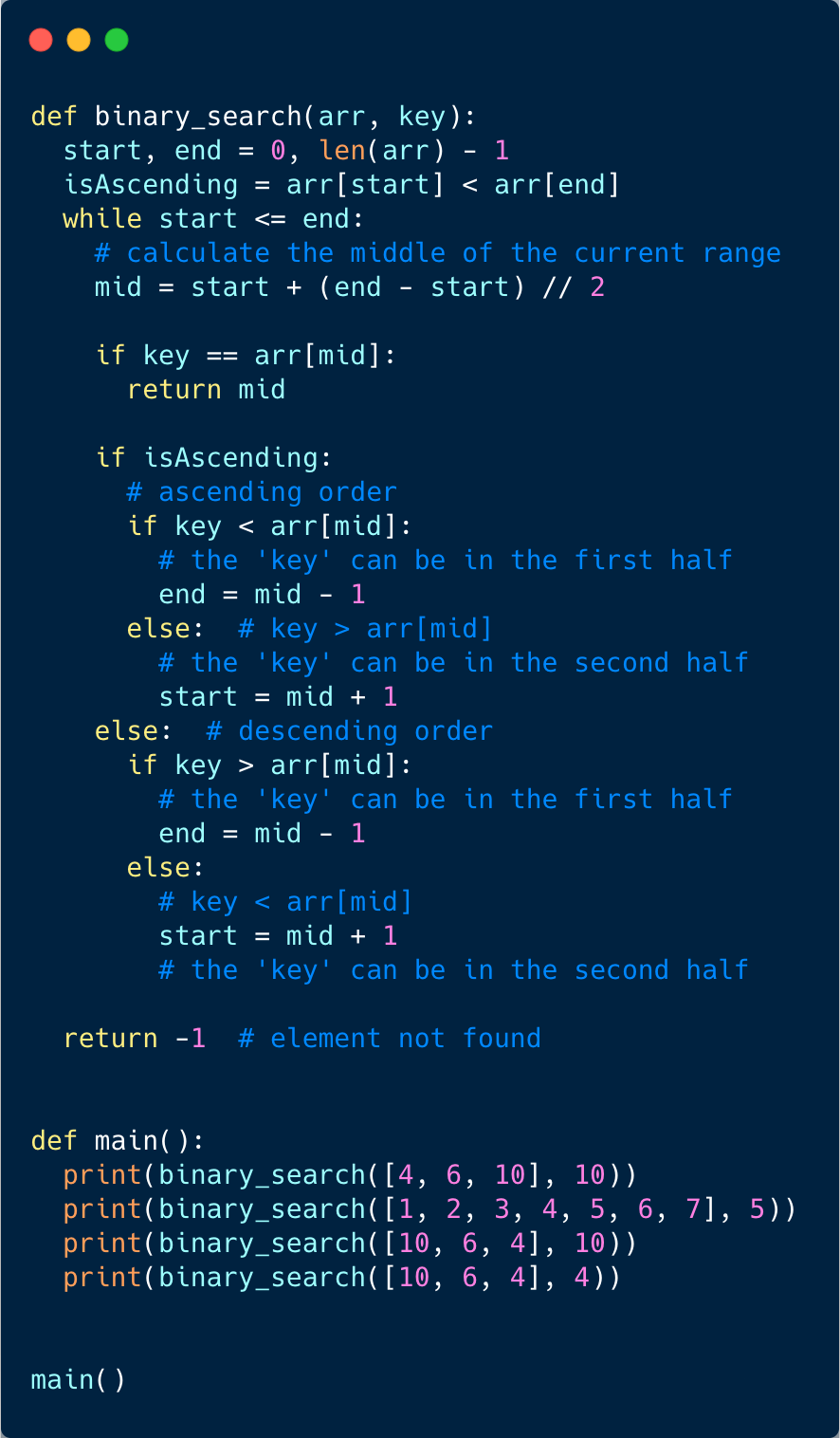 start and middle we can easily find out if the ‘key’ lies between indices start and middle; if it does, we can skip the second part => end = middle -1.start = middle + 1.Since we are reducing the search range by half at every step, this means that the time complexity of our algorithm will be O(logN) where ‘N’ is the total elements in the given array.