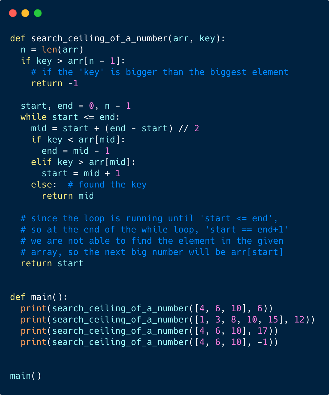 We can use a similar approach as discussed in Order-agnostic Binary Search. We will try to search for the ‘key’ in the given array. If we find the ‘key’, we return its index as the ceiling. If we can’t find the ‘key’, the next big number will be pointed out by the index start.