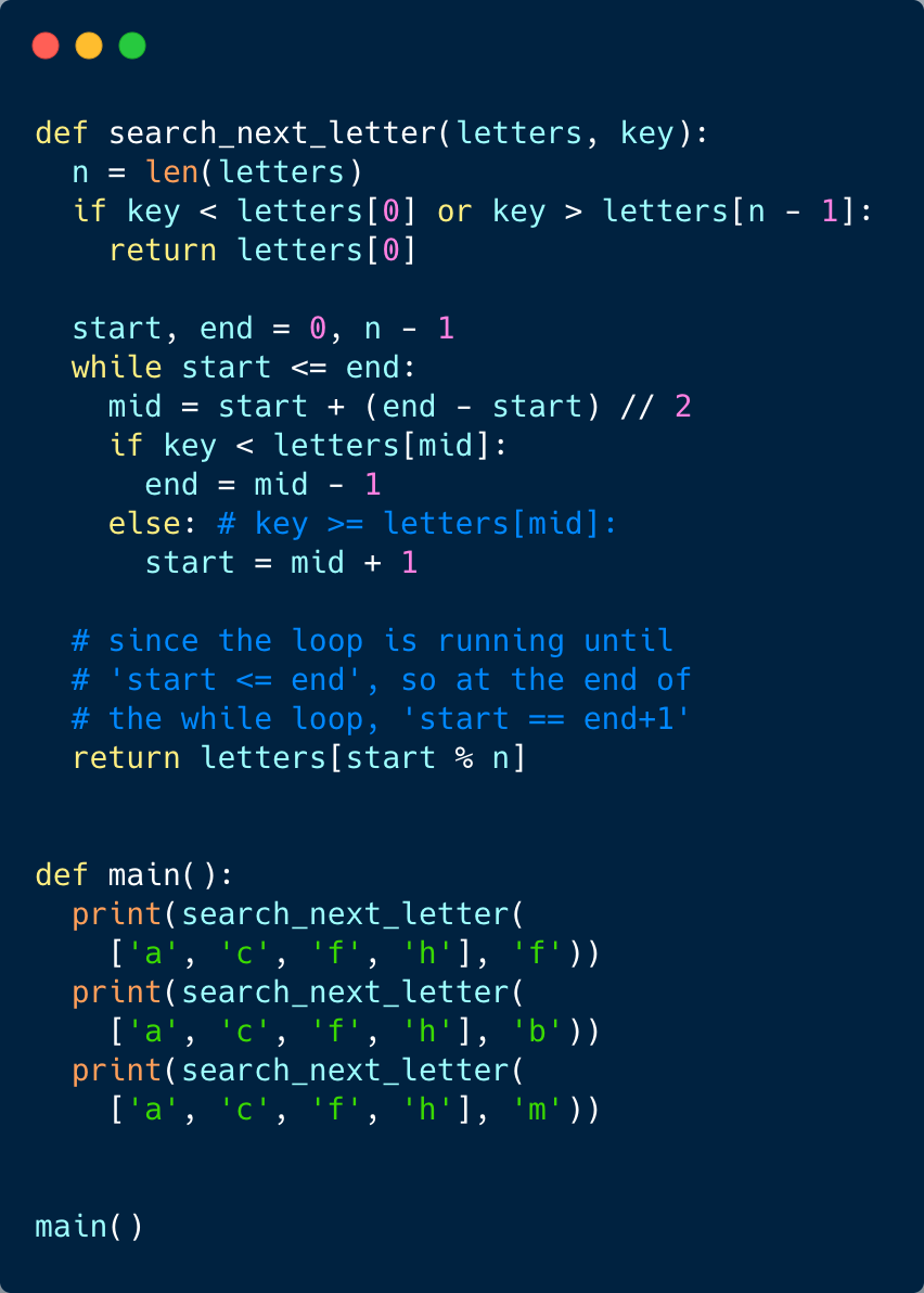 key == arr[middle]. To handle this case, we can update our start range to start = middle +1.In the end, instead of returning the element pointed out by start, we have to return the letter pointed out by start % array_length. This is needed because of point 2 discussed above. Imagine that the last letter of the array is equal to the ‘key’. In that case, we have to return the first letter of the input array.