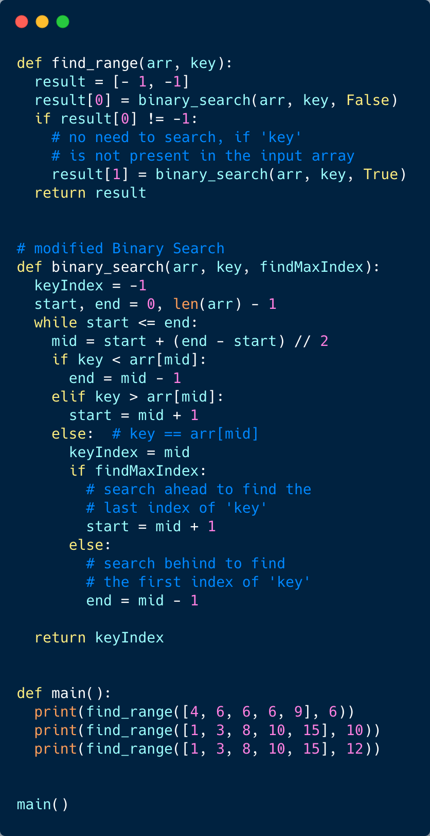 end = middle - 1 to see if the key is present before middle.start = middle + 1 to see if the key is present after middle.In both cases, we will keep track of the last position where we found the ‘key’. These positions will be the required range.